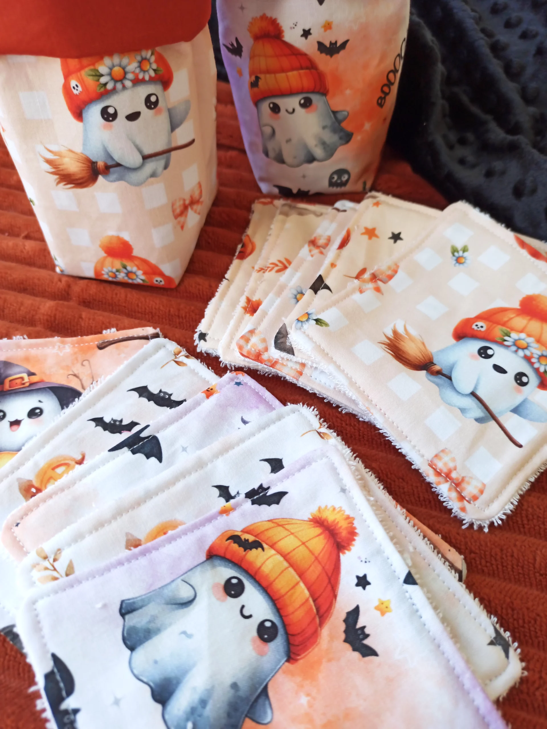 Alliez écologie et originalité avec ce lot de lingettes démaquillantes lavables aux motifs Halloween ! Douces pour la peau, elles remplacent les cotons jetables tout en apportant une petite touche festive à votre routine beauté.