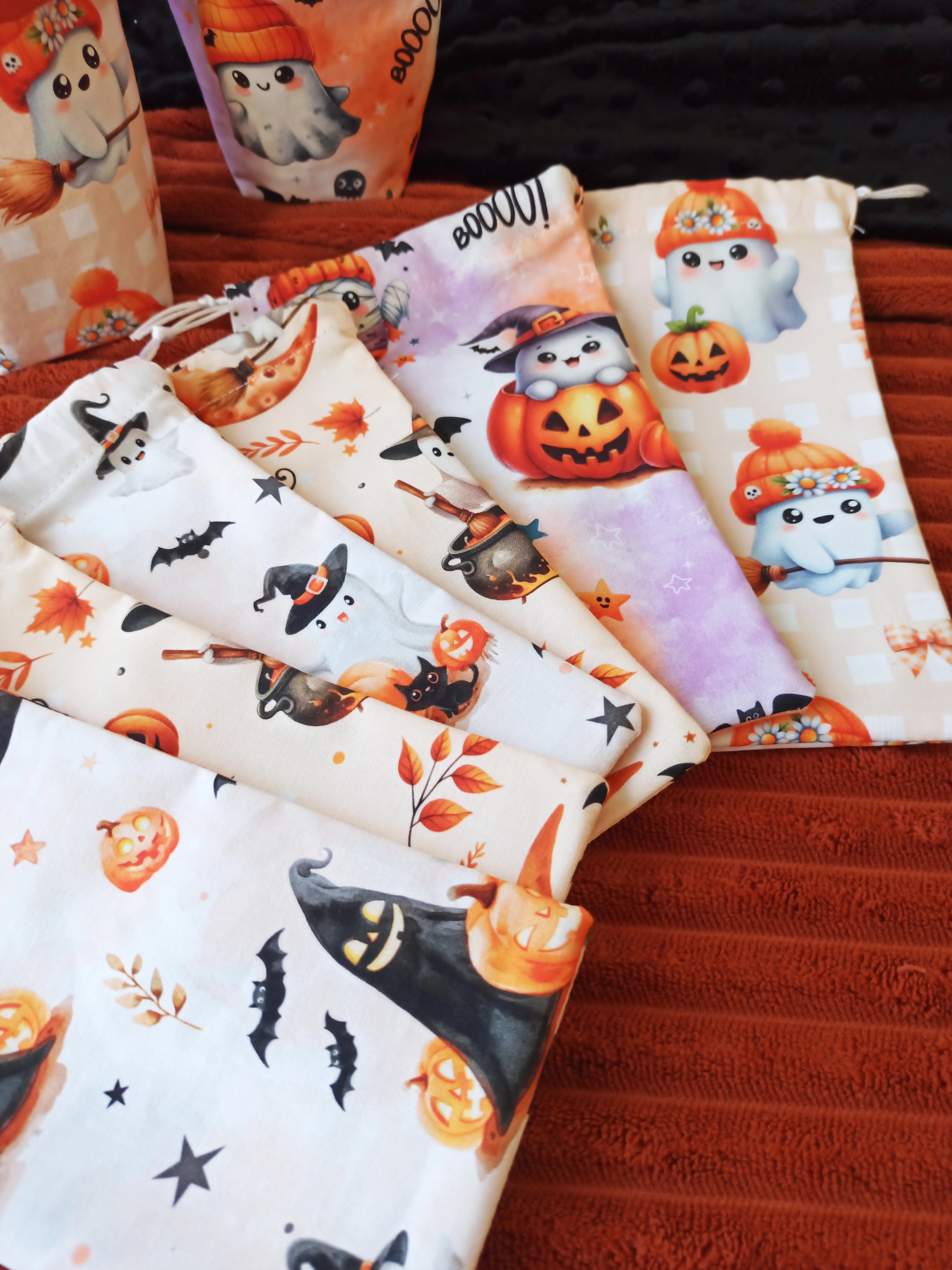 Préparez vos récoltes de bonbons avec style grâce à ce pochon coulissant en tissu aux motifs Halloween ! Pratique, réutilisable et terriblement mignon, il accompagnera petits et grands pour la chasse aux friandises.